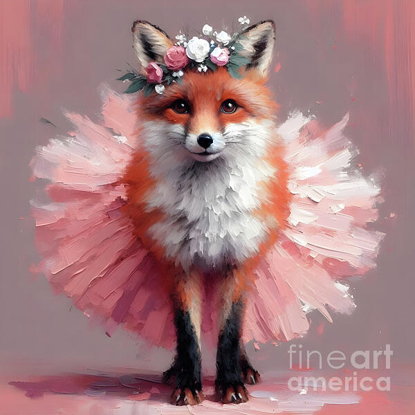 A whimsical fox is adorned with a floral crown and a fluffy pink tutu, exuding an elegant yet playful vibe. The background complements the fox’s... more