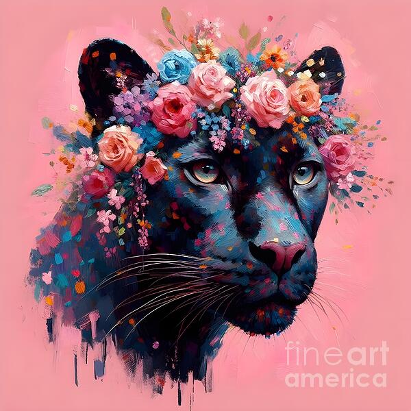 A majestic panther is adorned with a vibrant crown of roses and various flowers, set against a soft pink background. The colorful floral elements... more