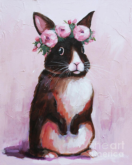 A cute rabbit adorned with a crown of pink roses stands upright against a soft pink background. The juxtaposition of the rabbit's dark fur with the... more