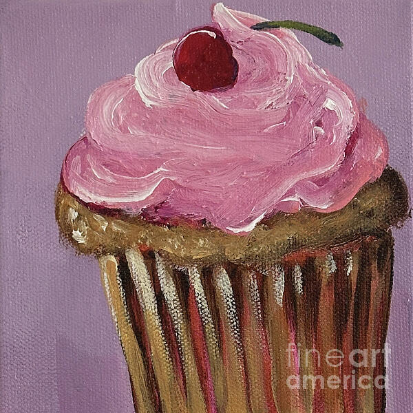 A cupcake with pink frosting and a cherry on top stands out against a light purple background. The rich swirls of the frosting add a whimsical touch... more