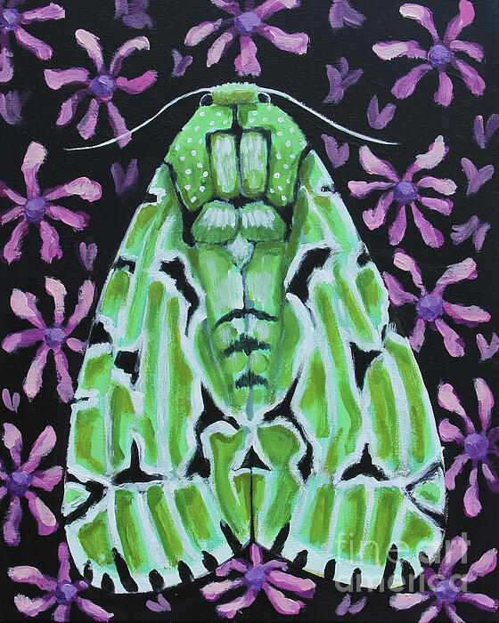 A vibrant green moth with distinct black and white patterns is set against a backdrop of swirling purple flowers. The black background accentuates... more