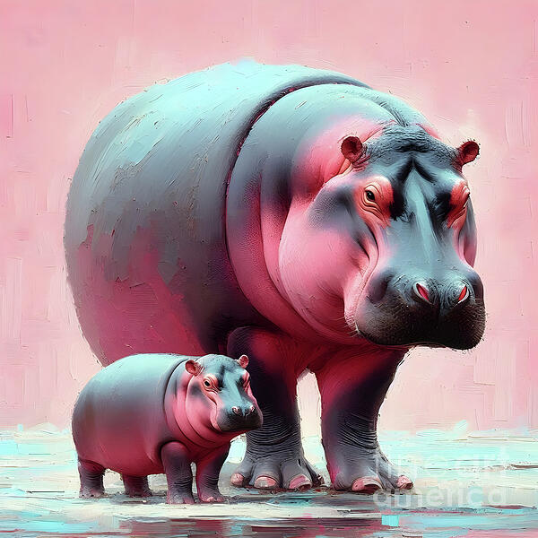 Two hippos, one large and one baby, stand side by side against a pink background. The scene captures a gentle and vibrant display of the animals with... more