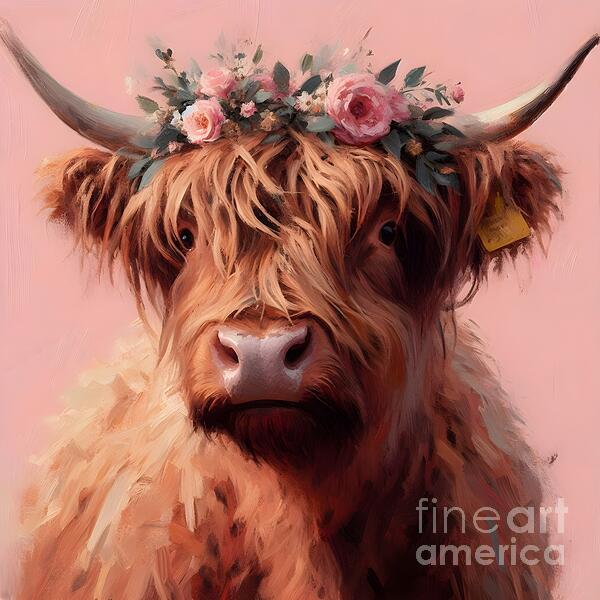 A Highland cow gazes forward, adorned with a wreath of pink and white flowers resting on its head. The soft pink background complements the floral... more