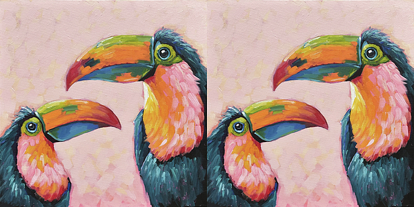 Two vibrant toucans with strikingly colorful beaks face each other against a soft pink background. Their feathers display a mix of blues, greens, and... more
